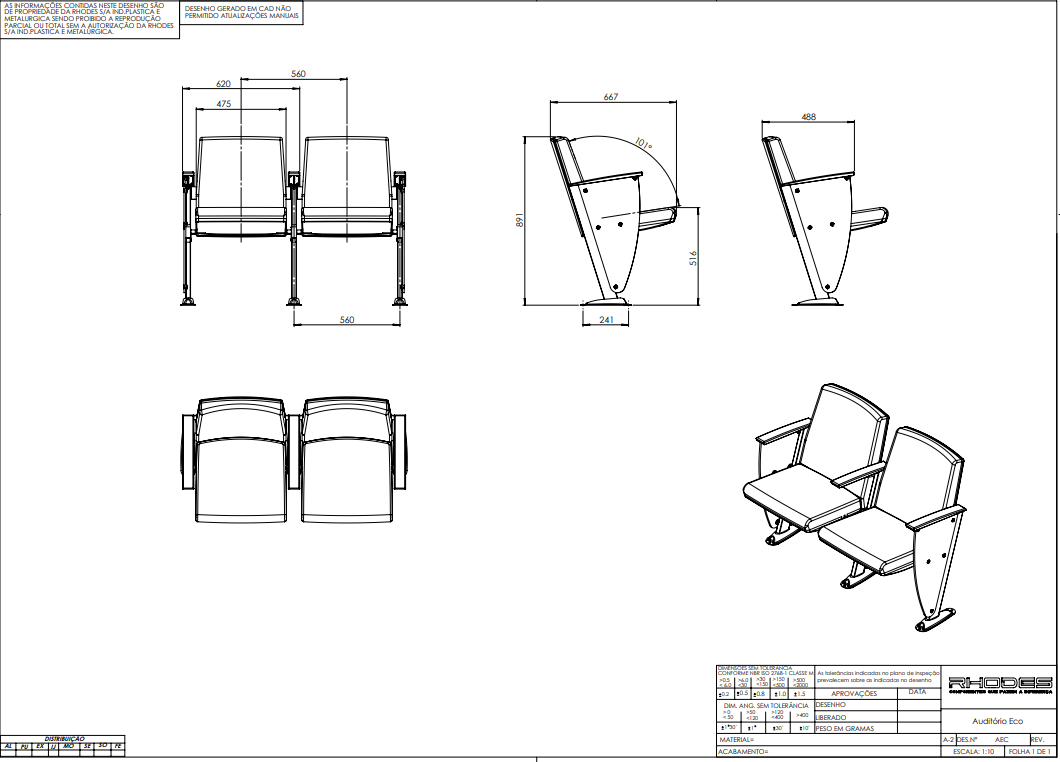 ° Conjunto de assento formado por chassis de assento em madeira compensada conformada, com capa de assento em polipropileno copolímero injetado fixada por sistema de garras integradas à capa e olhais de polipropileno copolímero injetado fixados no chassis, eixos basculantes em aço ABNT 1010/1012 soldados em chapa de aço ABNT 1008/1010 e conjunto fixado por parafusos e porcas; contrapeso para retorno do assento por gravidade em aço ABNT 1008/1010; Espuma de assento com densidade média de 50-55 kg/m3, possui 482mm de largura x 482mm de profundidade e espessuras de 70 mm;